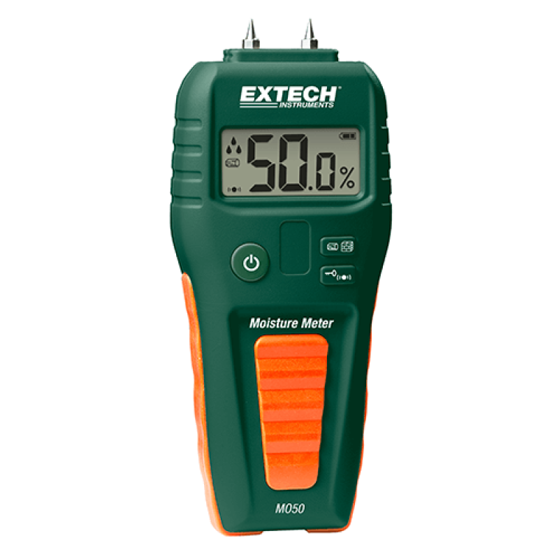 The MO50 is a compact pin moisture meter. MO50 displays moisture level in wood and building materials such as wall board, sheet rock, cardboard, plaster, concrete and mortar. This product is complete with pins (4), protective cap and 9V battery.